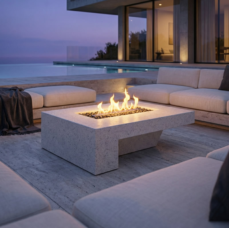 Infinity ateş çukuru, lineer alev formu ile mekâna sıcaklık ve sofistike bir atmosfer kazandırır. Doğal taş dokusunu andıran yüzeyi, modern mimariyle kusursuz uyum sağlar. Gün batımında alevlerin oluşturduğu ambiyans, yaşam alanlarını sıradanlıktan çıkararak benzersiz bir deneyime dönüştürür.